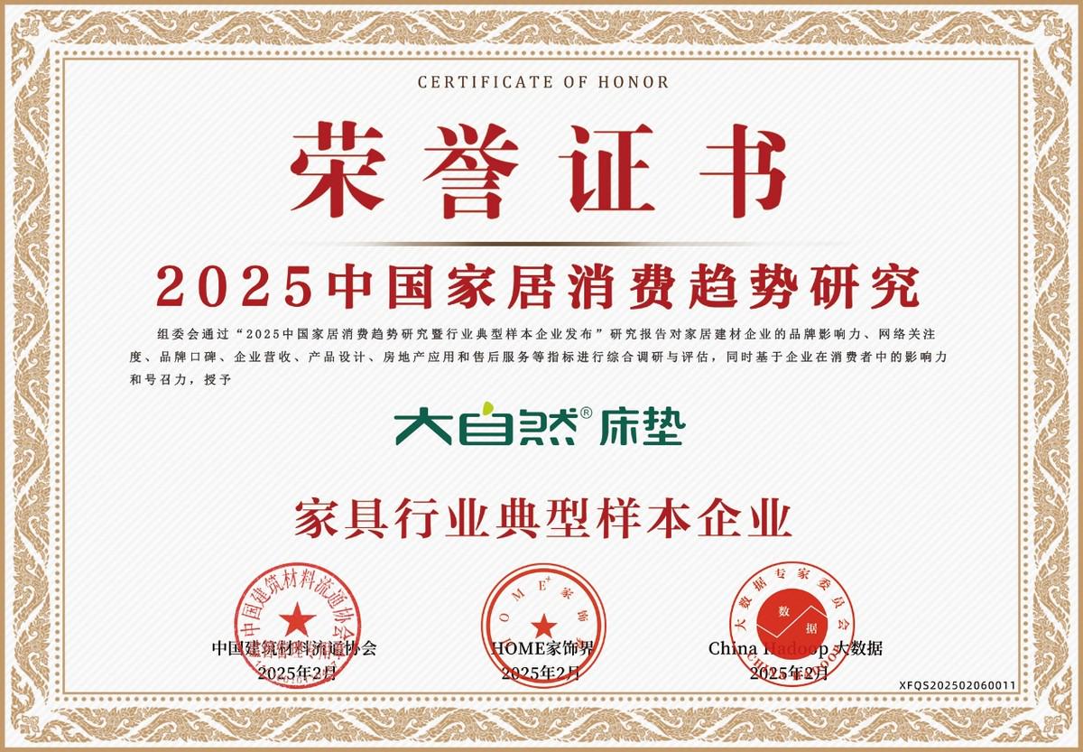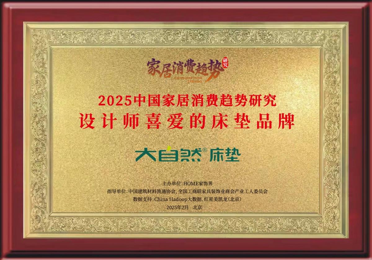 2025年2月26日,備受矚目的《2025中國家居消費趨勢研究報告》在北京正式發(fā)布。大自然床墊以卓越的產(chǎn)品力、行業(yè)影響力及消費者良好的口碑,一舉斬獲“消費者喜愛的床墊品牌”、“設計師喜愛的床墊品牌”雙項大獎,并再度被授予“家具行業(yè)典型樣本企業(yè)”稱號。這一榮譽不僅彰顯了品牌在生態(tài)睡眠領域的領軍地位,更印證了其以科技賦能綠色家居、以匠心守護國民健康的長期承諾。