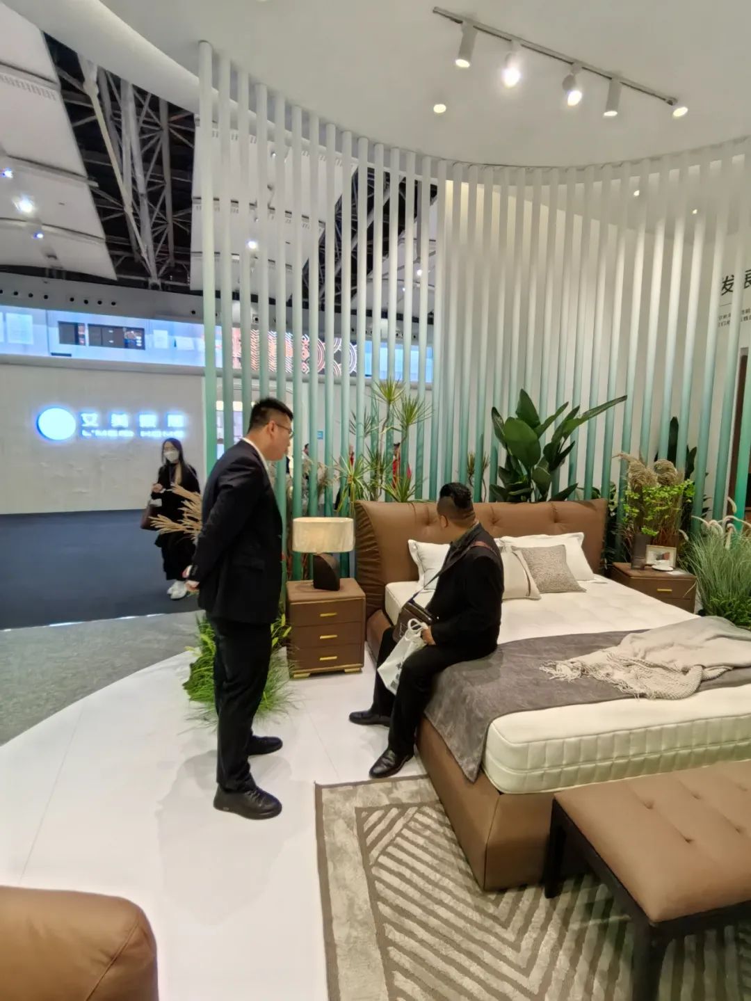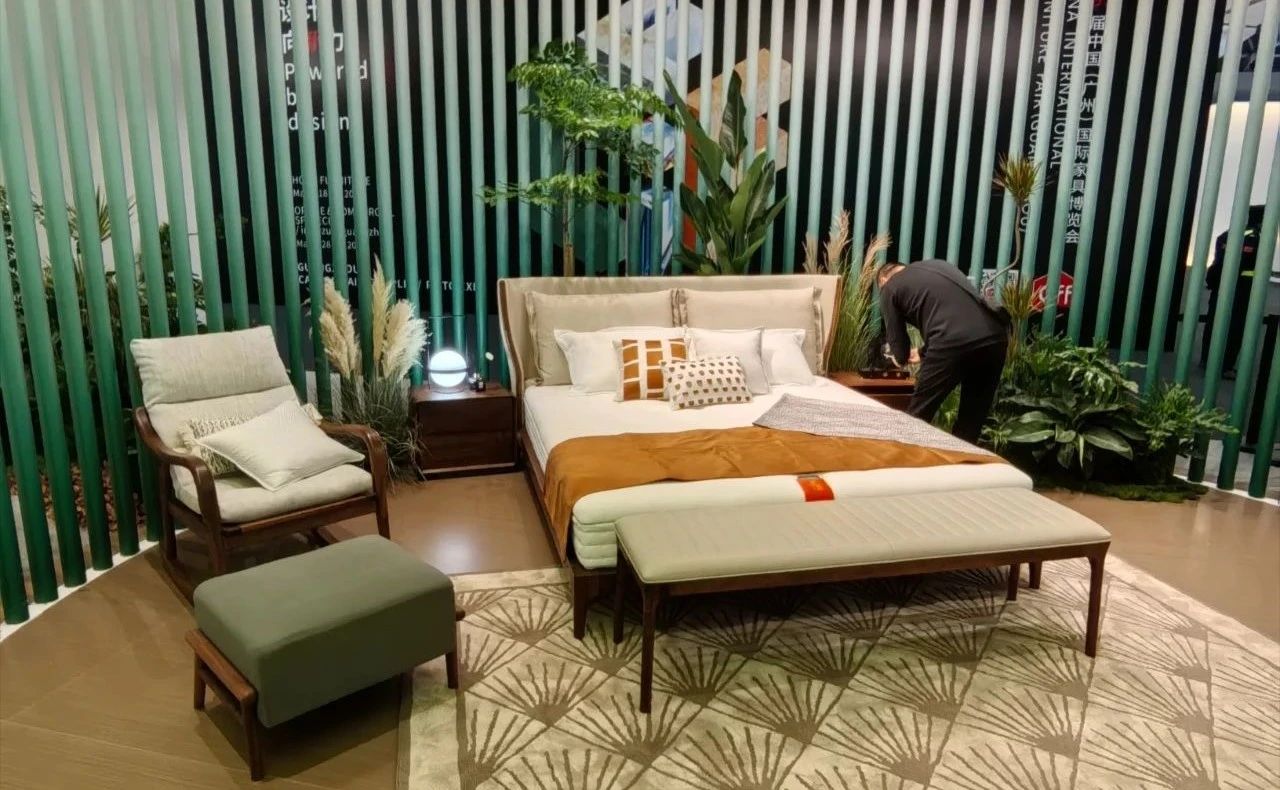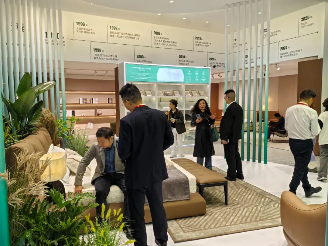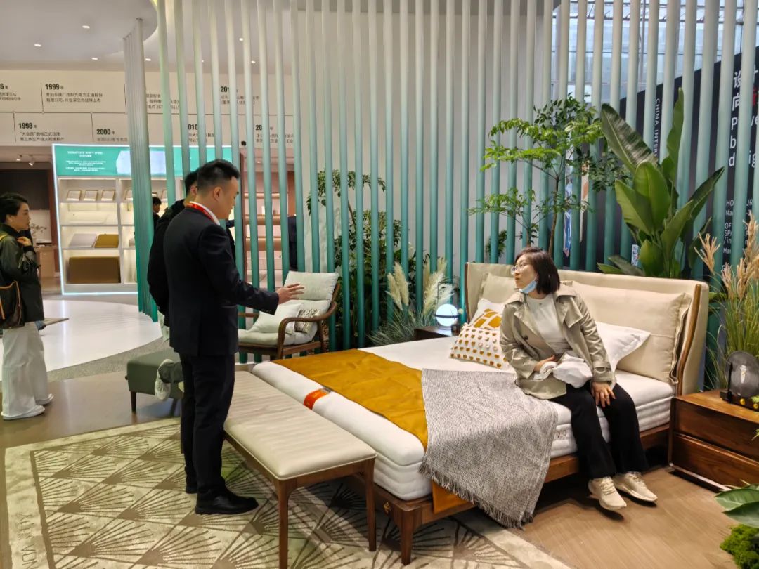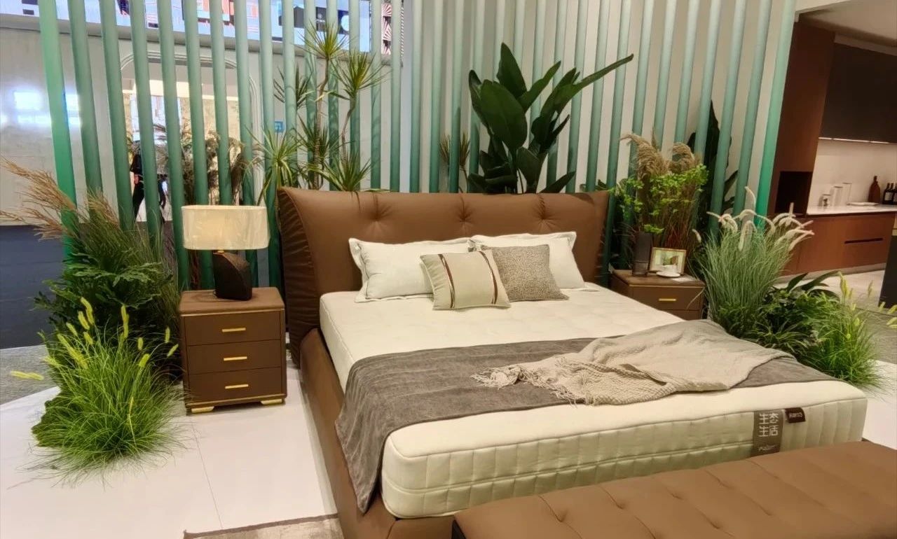 展會開展首日,琶洲展館內人流如織,來自全球的經(jīng)銷商、設計師及消費者齊聚一堂。大自然床墊以“生態(tài)生活”為設計理念打造的沉浸式主題展館成為全場焦點。展區(qū)通過天然棕床墊、生態(tài)整家定制與生態(tài)原木家具的結合,模擬出臥室、客廳等居家場景,吸引眾多觀眾駐足體驗。