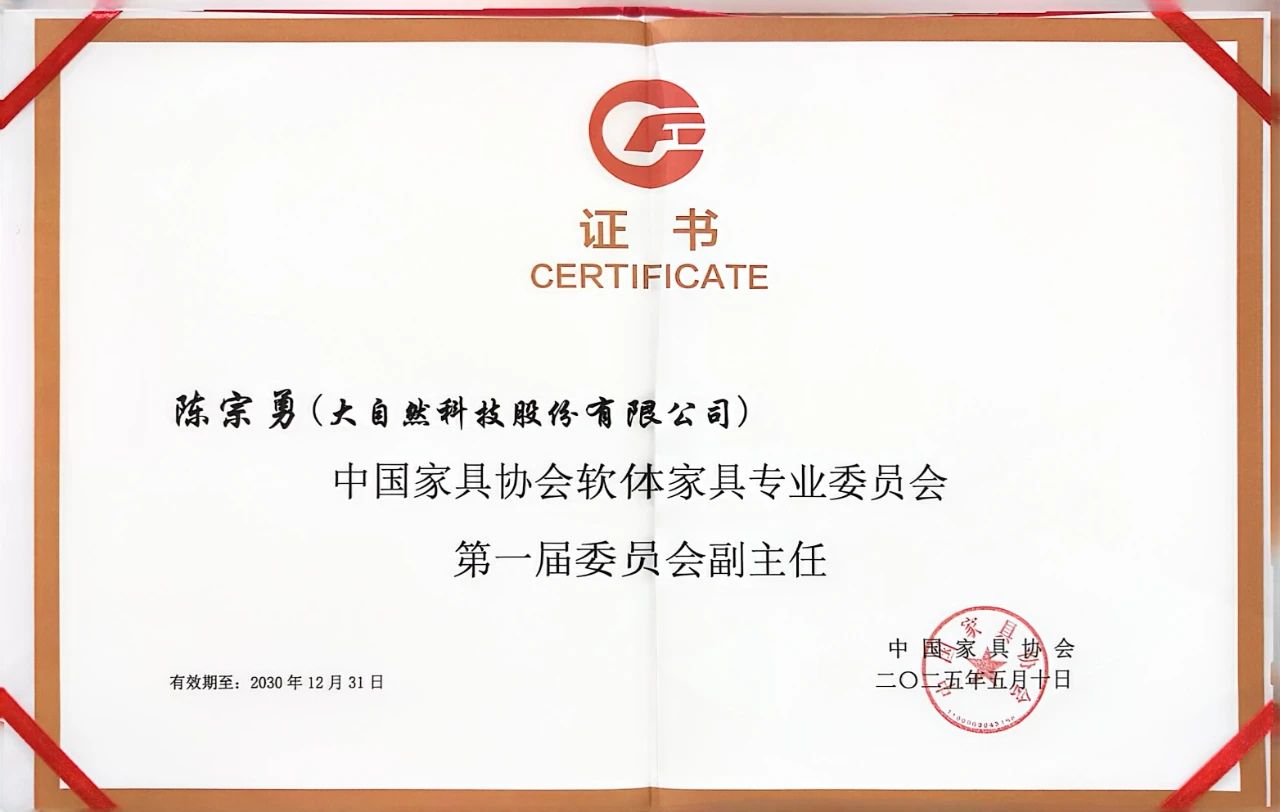 大自然床墊當(dāng)選中國家具協(xié)會軟體家具專業(yè)委員會副主任單位